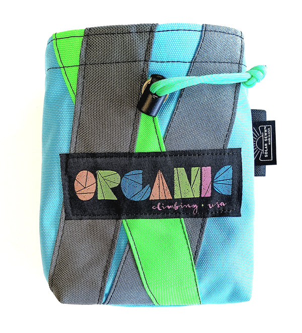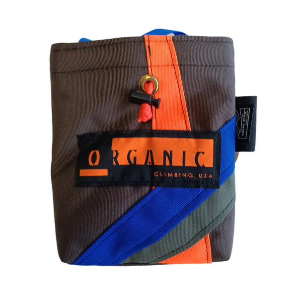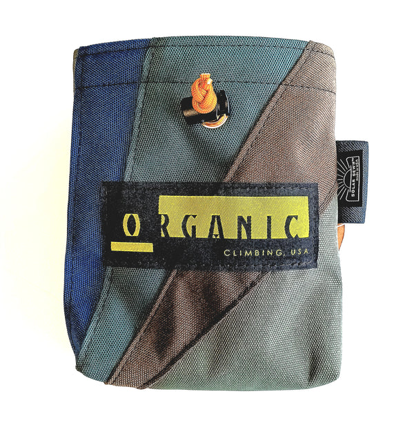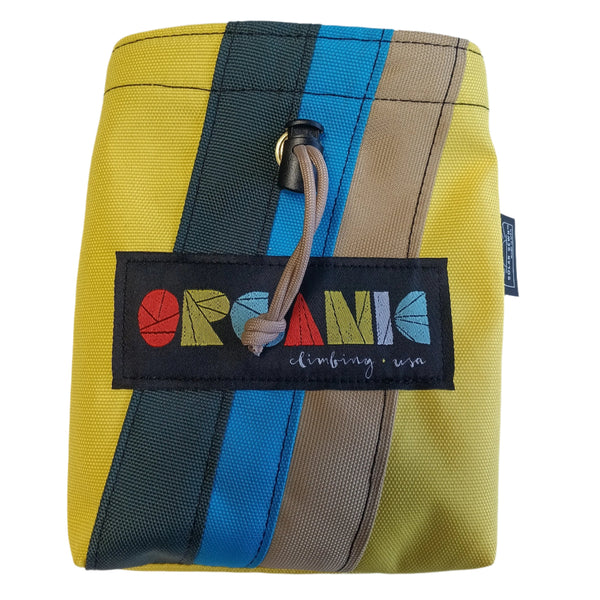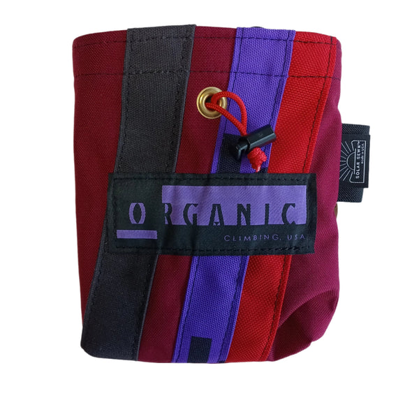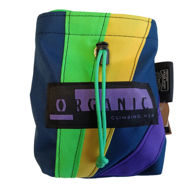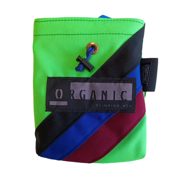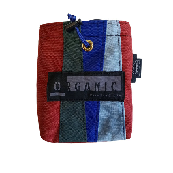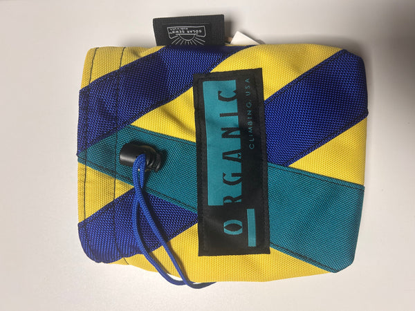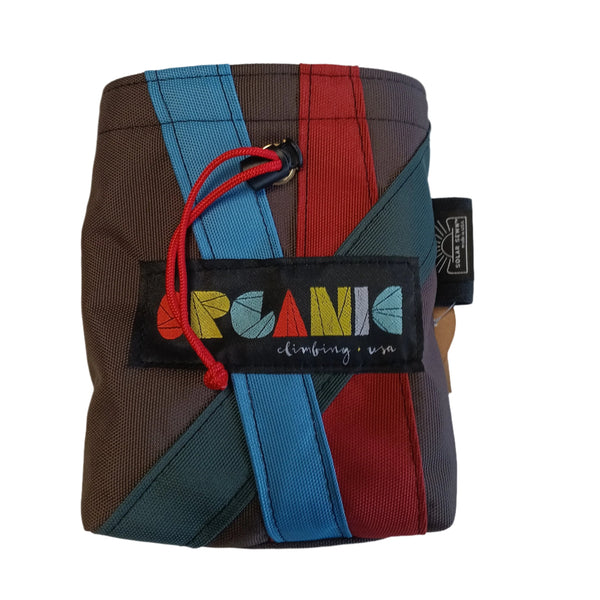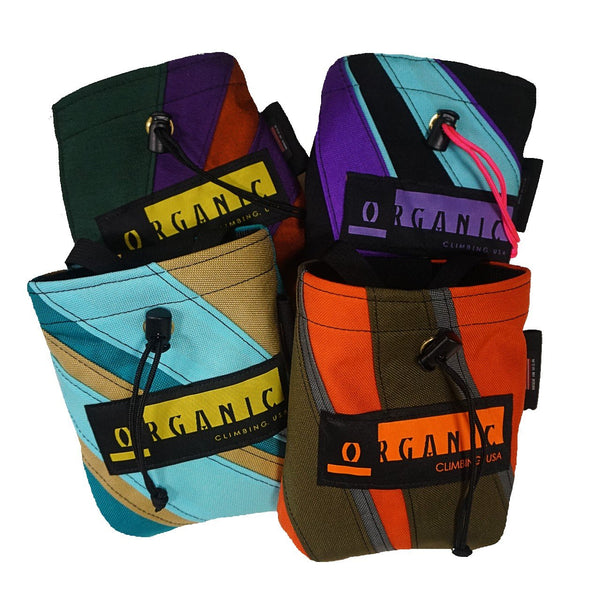 Made from your choice of colours in assorted one of a kind designs by recycling our cutting scraps, the Chalk Bag includes waist belt. 1000d Cordura nylon shell with Polyester fleece liner.