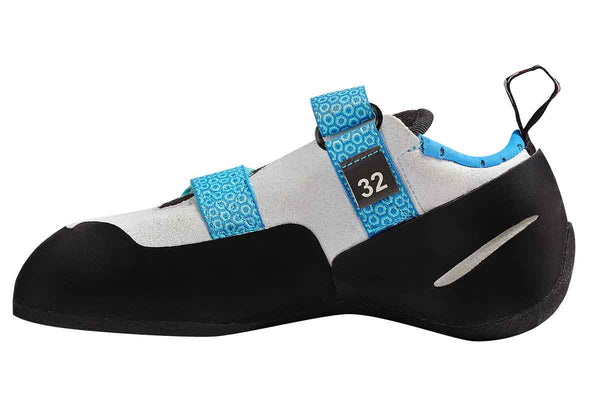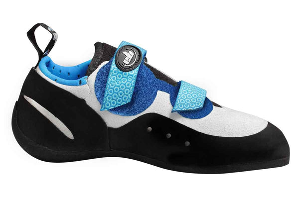 The two Velcro straps allows for ease getting the shoe on and off. This goes with the Vegan friendly upper which move with the foot for utmost flexibility giving the shoe a very comfortable fit. The 4mm spider web rubber allows the climber to be able to stand on small and large holds whilst still allowing them to be able to smear on the wall. The use of 4mm of rubber helps with durability and expands the life of the shoe.
